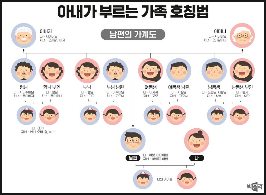 또 혼인으로 인한 인척 호칭도 다양합니다. 예를 들어, 아내 입장에서 남편의 형은 아주버님, 남편의 여동생은 아가씨라고 부르고, 남편은 처가 쪽에서 장인을 장인어른, 장모를 장모님이라 부릅니다.